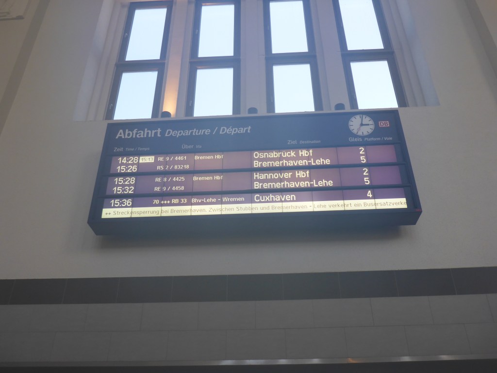 Mein Reiseplan ist nun durcheinander geraten. In Bremen muss ich die nächste Stunde warten, bis mich ein Zug weiter nach Süden bringt.