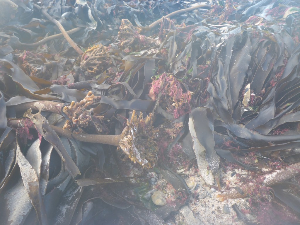 Der Spülsaum liegt weit am Strand weit oben, markiert durch einen Wall von losgerissenen Laminaria. Gekocht sollen sie halbwegs genießber sein und den Insulanern in sehr mageren Zeiten über den Winter geholfen haben.